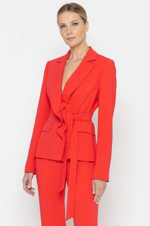 Koralowy żakiet z wiązaniem i ozdobnym kołnierzem