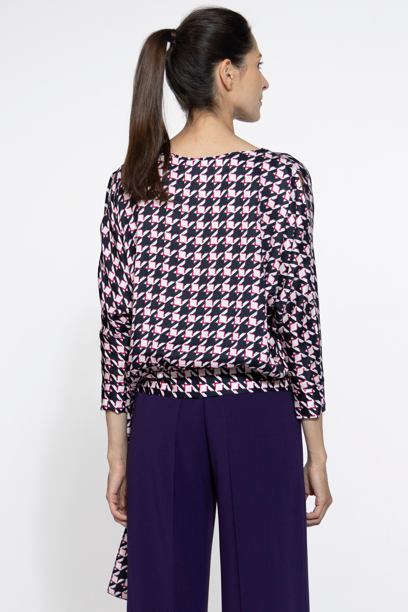 Warto zwrócić uwagę na fioletowo - fuksjowy wzór pepitki: wyrazisty i modny, a jednocześnie subtelny, co czyni tę bluzkę idealnym wyborem na wiele okazji. Pepitka to wciąż jedna z najbardziej eksponowanych grafik na wybiegach mody.