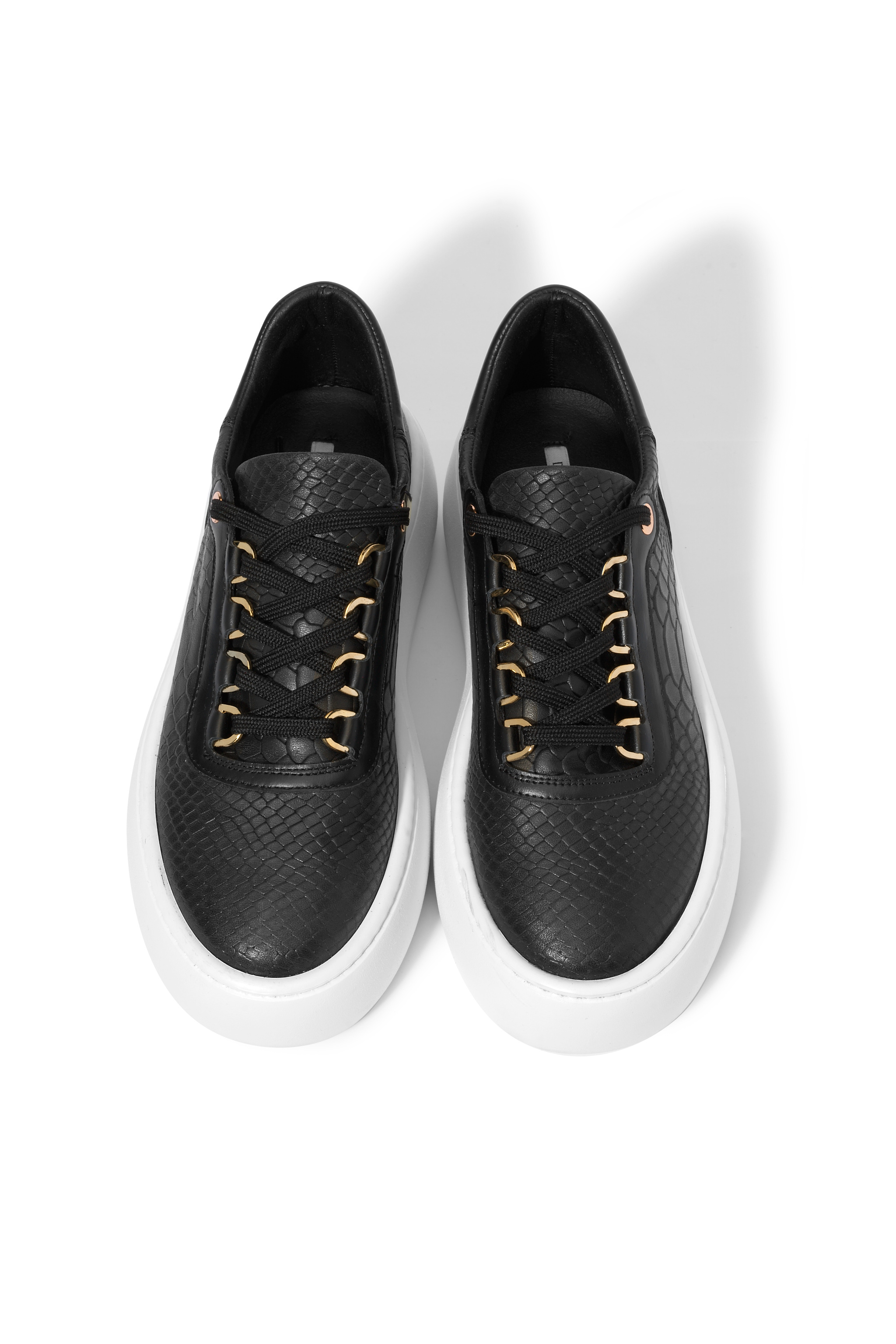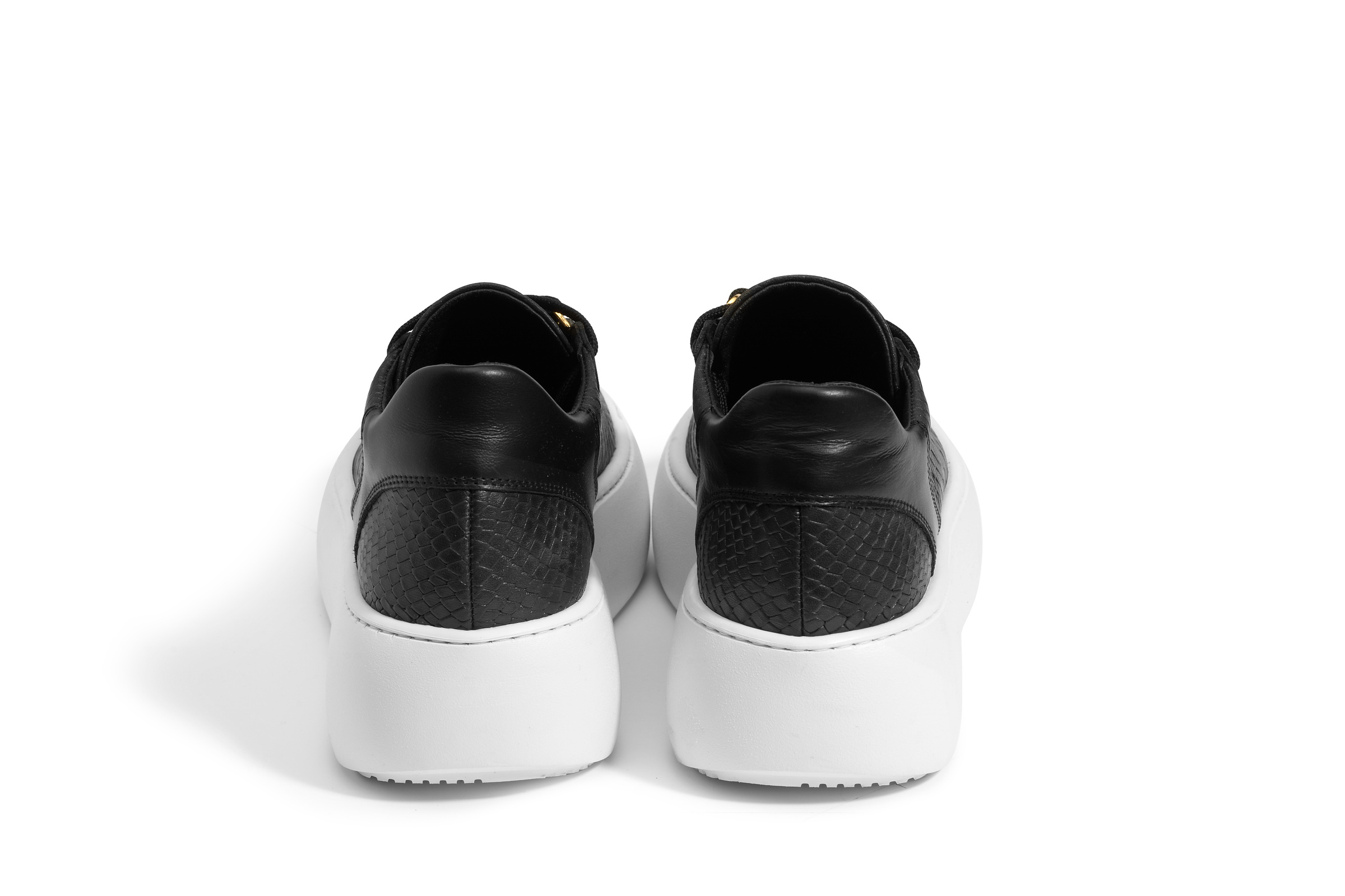 Eleganckie czarne, skórzane sneakersy. Ich charakterystyczna, biała grubsza podeszwa wyróżnia je spośród innych modeli, tworząc efektowny kontrast. To jednak nie wszystko, co sprawia, że te buty są wyjątkowe.